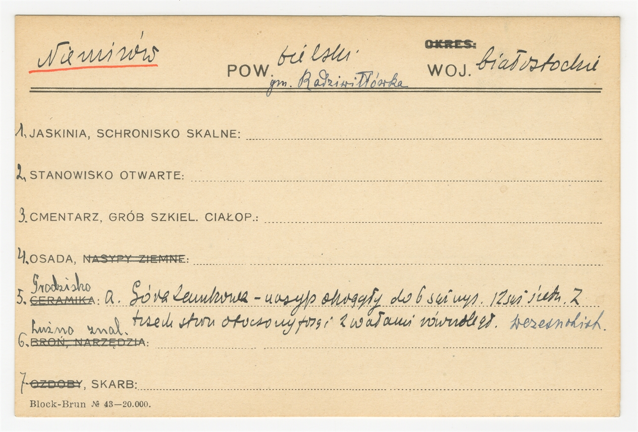 Karta stanowiska "Niemirów gm. Radziwiłłówka pow. bielski woj. białostockie" (druk rękopis) - strona 1