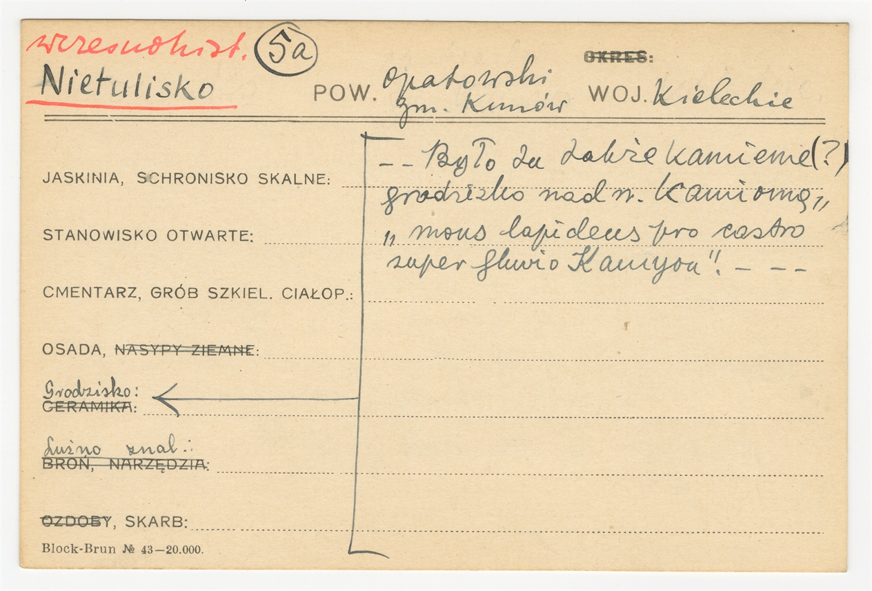 Karta stanowiska "Nietulisko gm. Kunów pow. opatowski woj. Kieleckie" (druk rękopis) - strona 1