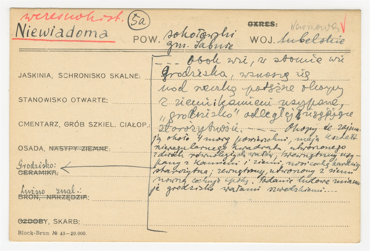Karta stanowiska "Niewiadoma gm. Sabnie pow. sokołowski woj. lubelskie [skreślone] Warszawa" (druk rękopis) - strona 1