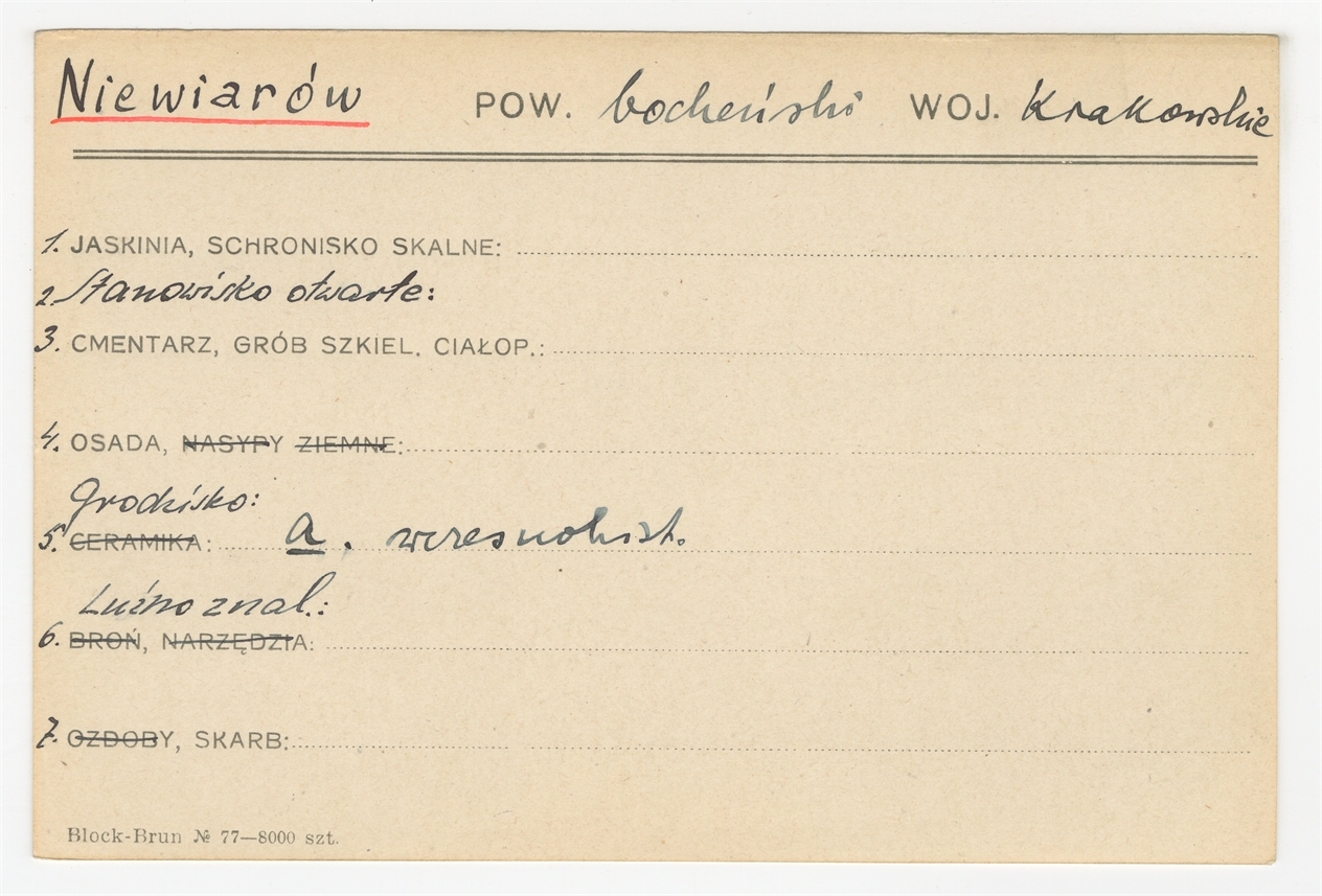 Karta stanowiska "Niewiarów pow. bocheński woj. Krakowskie" (druk rękopis) - strona 1