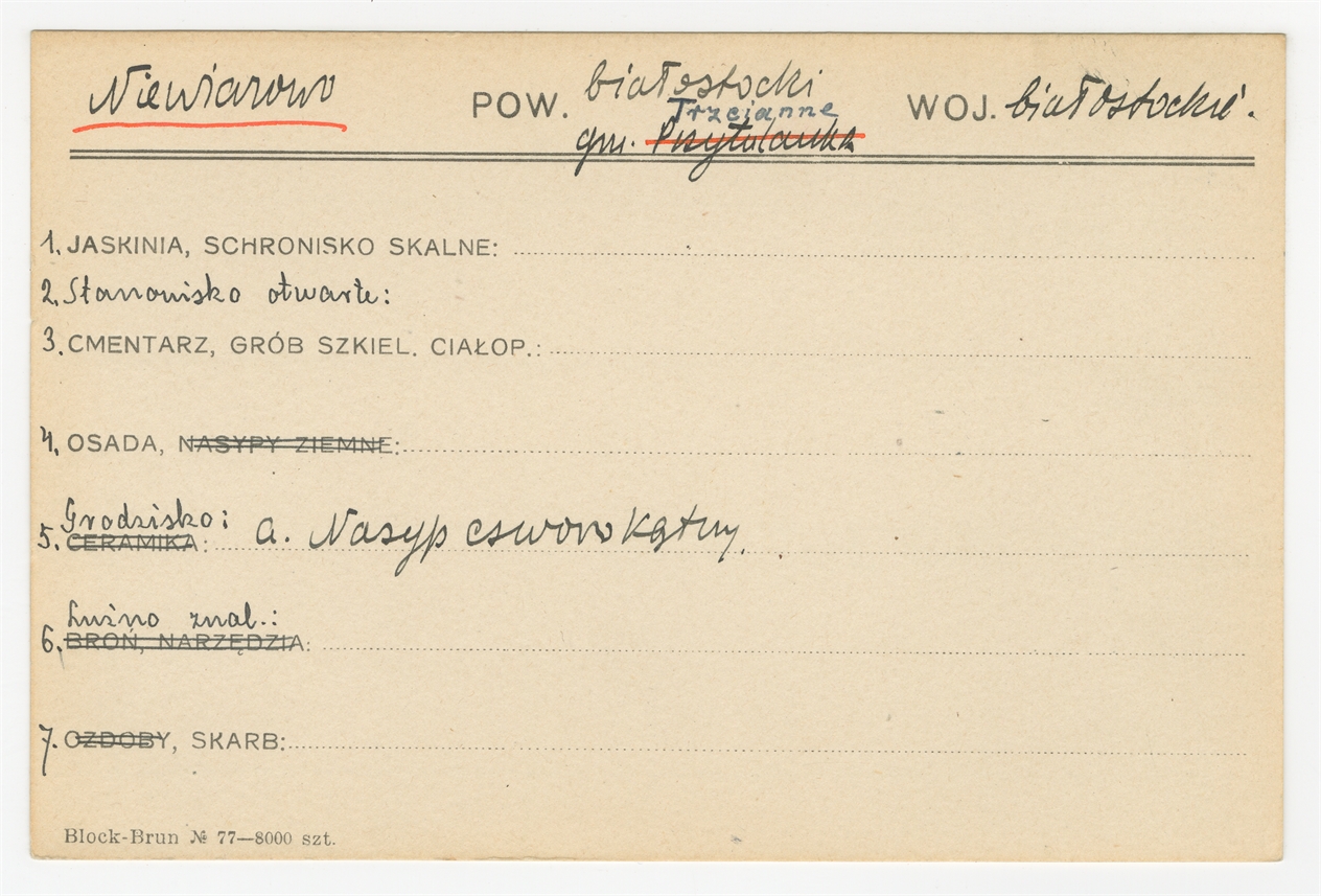 Karta stanowiska "Niewiarowo gm. Przytulanka [skreślone] Trzcianne pow. białostocki woj. białostockie" (druk rękopis) - strona 1