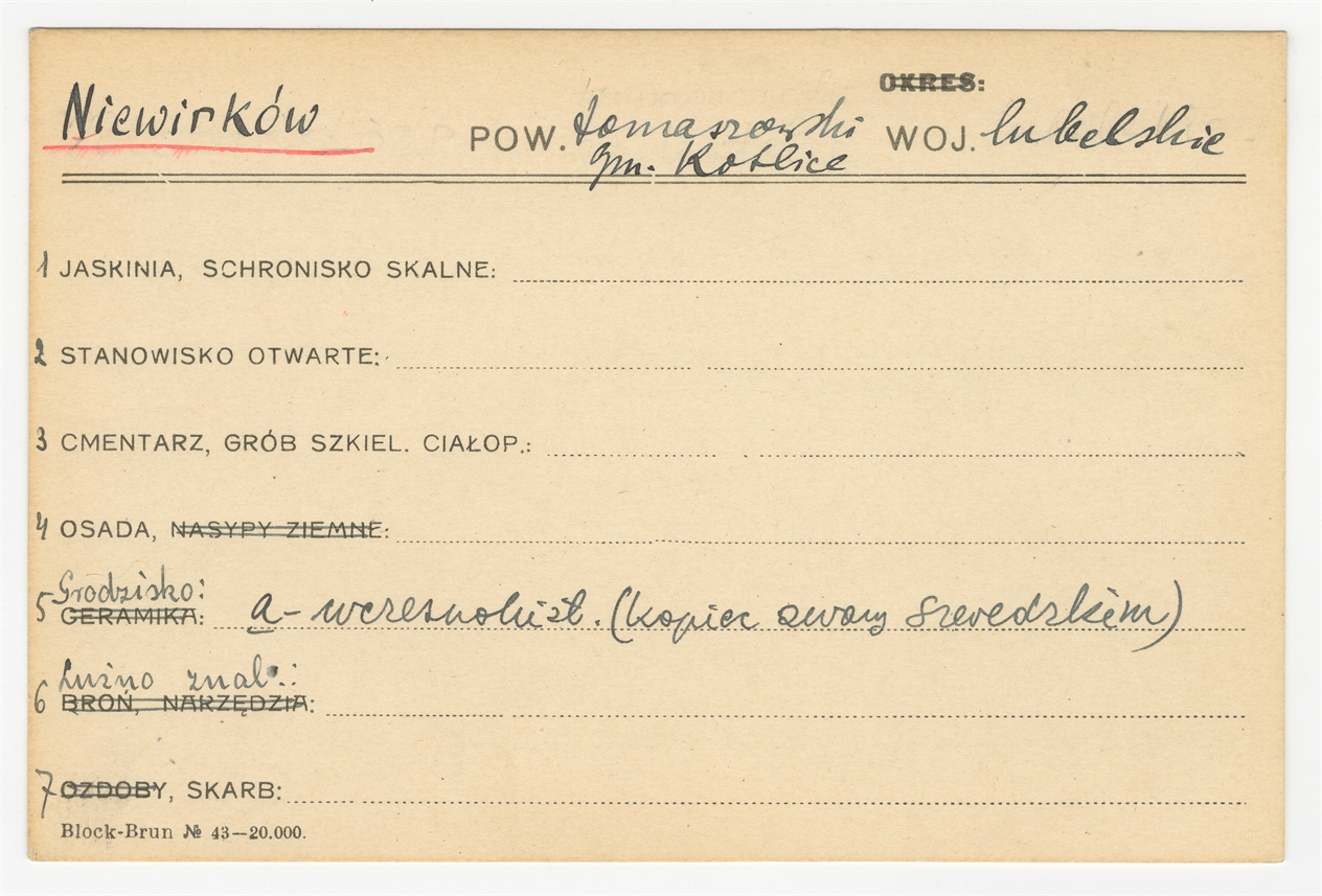 Karta stanowiska "Niewirków gm. Kotlice pow. tomaszowski woj. lubelskie" (druk rękopis) - strona 1