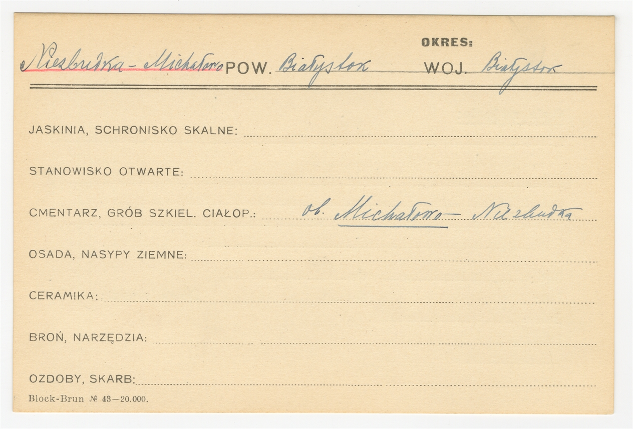 Karta stanowiska "Niezbudka - Michałowo" pow. Białystok woj. Białystok" (druk rękopis) - strona 1