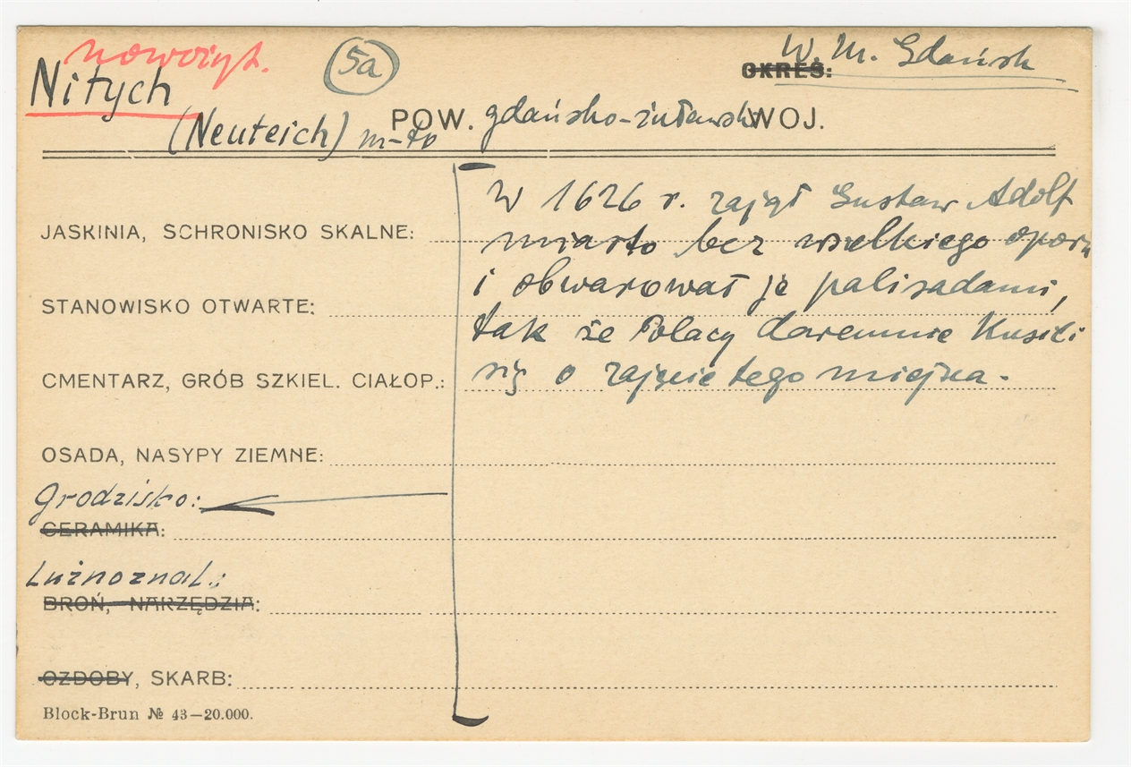 Karta stanowiska "Nitych (Neuteich) m-to pow. gdańsko-żuławski w.m. Gdańsk" (druk rękopis) - strona 1
