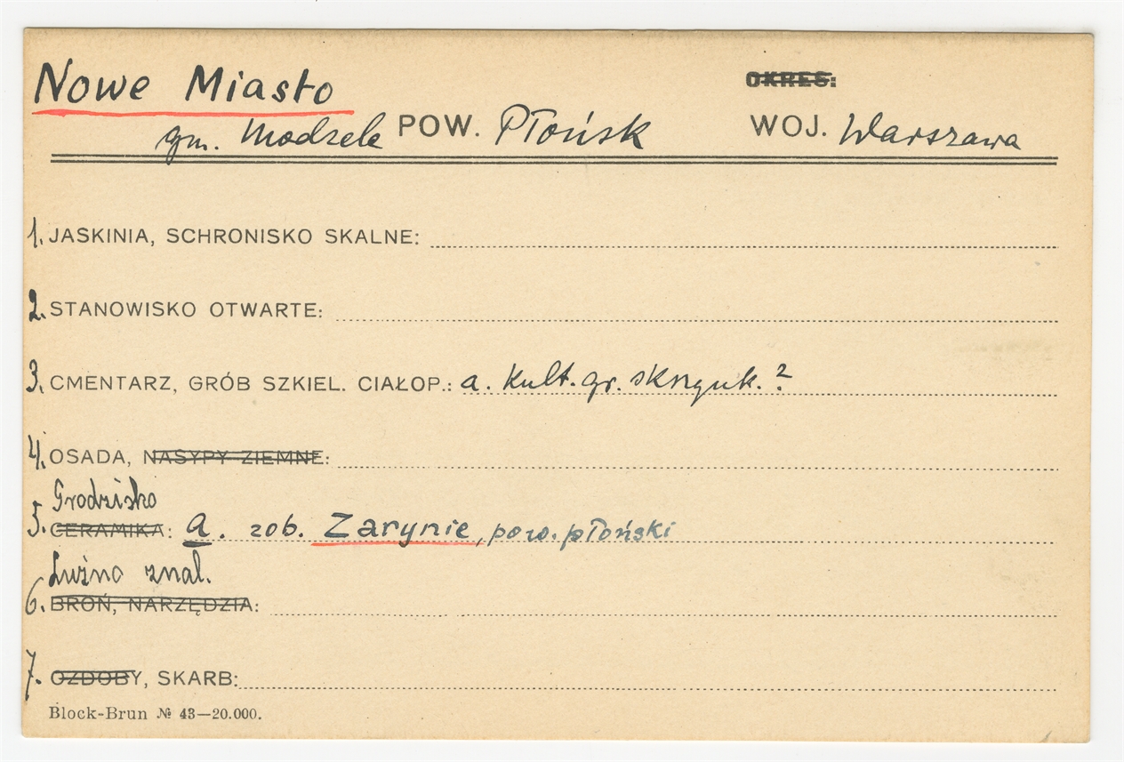 Karta stanowiska "Nowa Miasto gm. Modzele pow. Płońsk woj. Warszawa" (druk rękopis) - strona 1