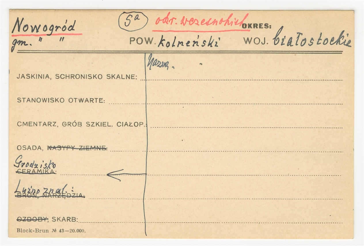 Karta stanowiska "Nowogród gm. Nowogród pow. kolneński woj. białostockie" (druk rękopis) - strona 1