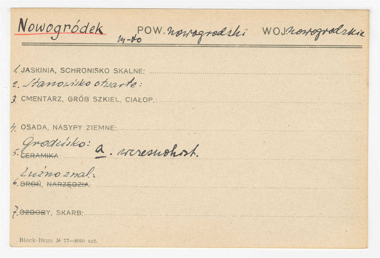 Karta stanowiska "Nowogródek m-to pow. nowogrodzki woj. nowogrodzkie" (druk rękopis) - strona 1