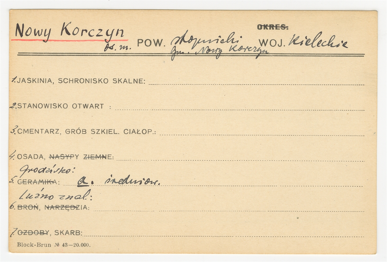 Karta stanowiska "Nowy Korczyn os.m gm. Nowy Korczyn pow. stopnicki woj. kieleckie" (druk rękopis) - strona 1
