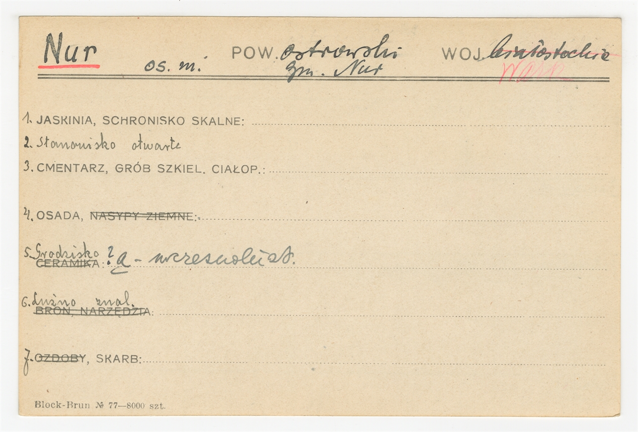 Karta stanowiska "Nur os. m. gm. Nur pow. Ostrowski woj. białostockie [skreślone] Warsz" (druk rękopis) - strona 1