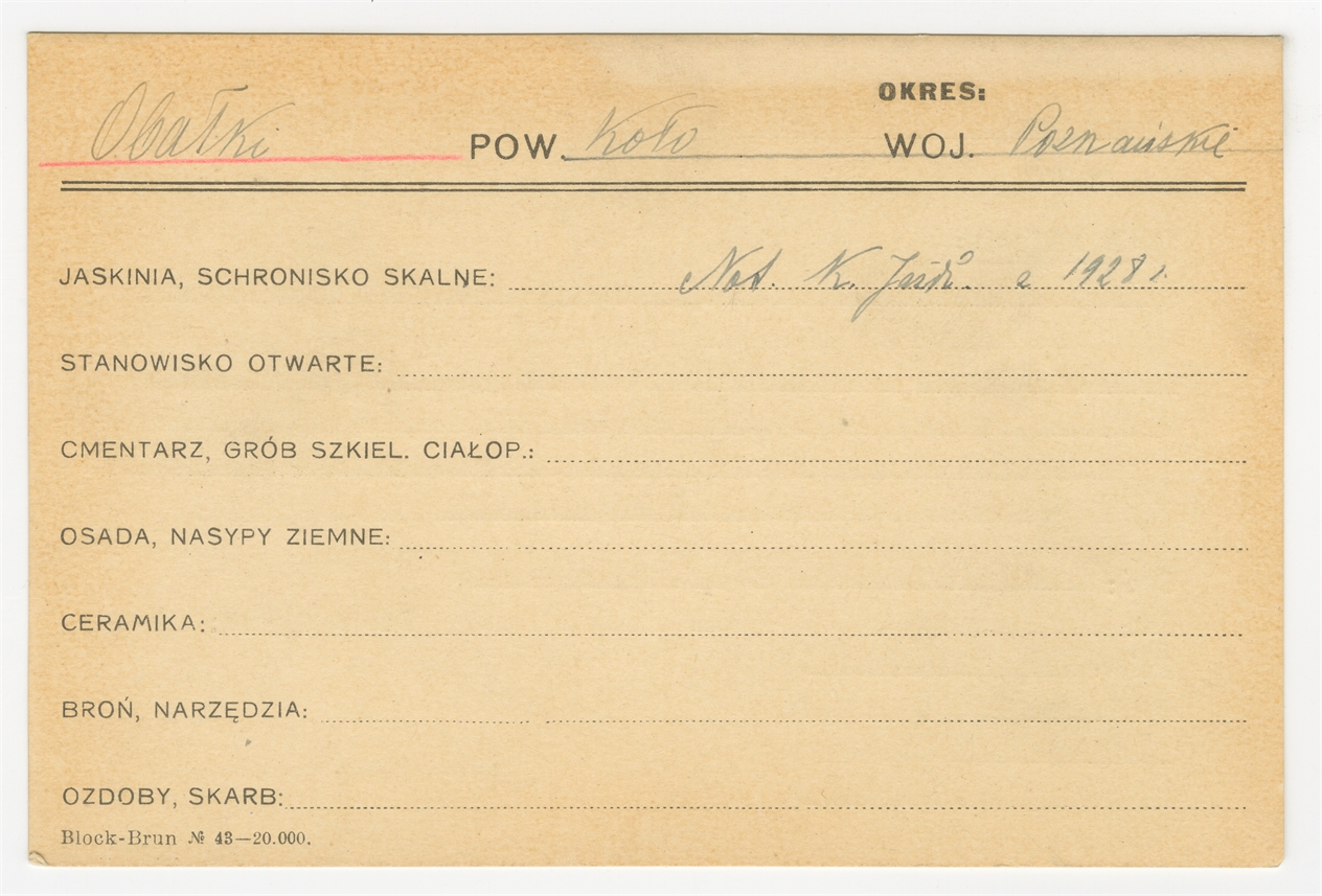 Karta stanowiska "Obałki pow. Koło woj. Poznańskie" (druk rękopis) - strona 1