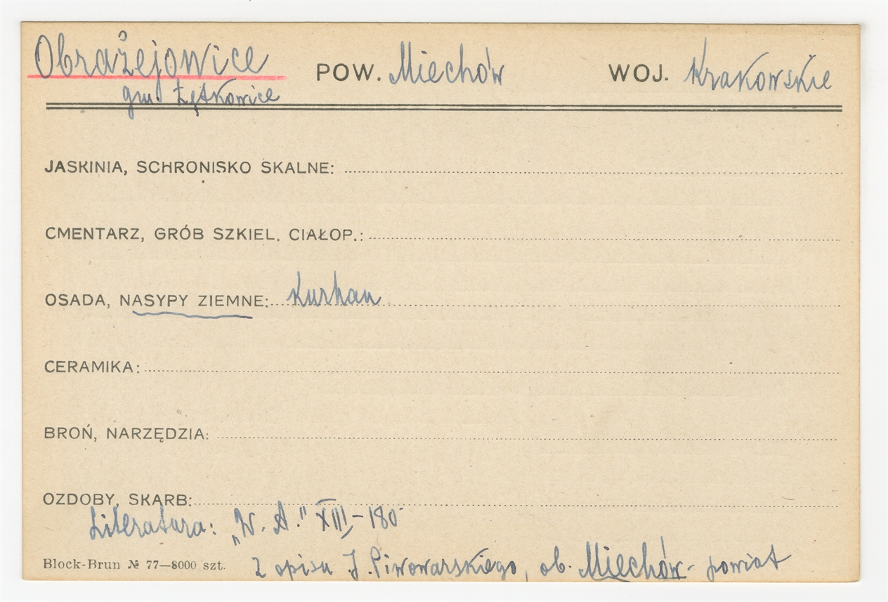 Karta stanowiska "Obrażejowice gm. Łętkowice pow. Miechów woj. Krakowskie" (druk rękopis) - strona 1