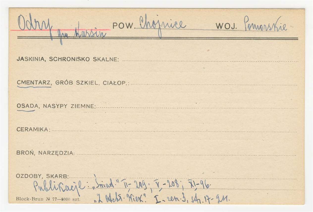 Karta stanowiska "Odry gm. Karsin pow. Chojnice woj. Pomorskie" (druk rękopis)