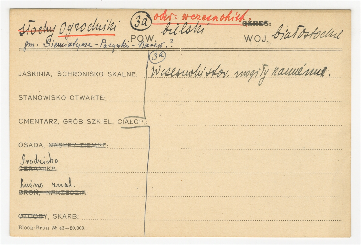 Karta stanowiska "Ogrodniki gm. Siemiatycze - Pasynki - Narew? pow. bielski woj. białostockie" (druk rękopis) - strona 1