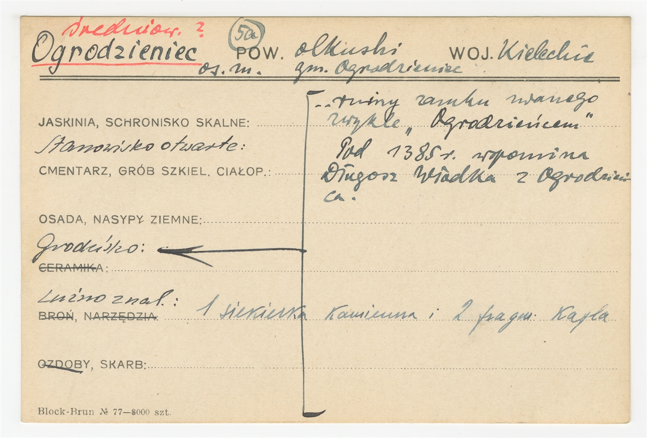 Karta stanowiska "Ogrodzieniec os. m. gm. Ogrodzieniec pow. Olkuski woj. Kieleckie" (druk rękopis) - strona 1