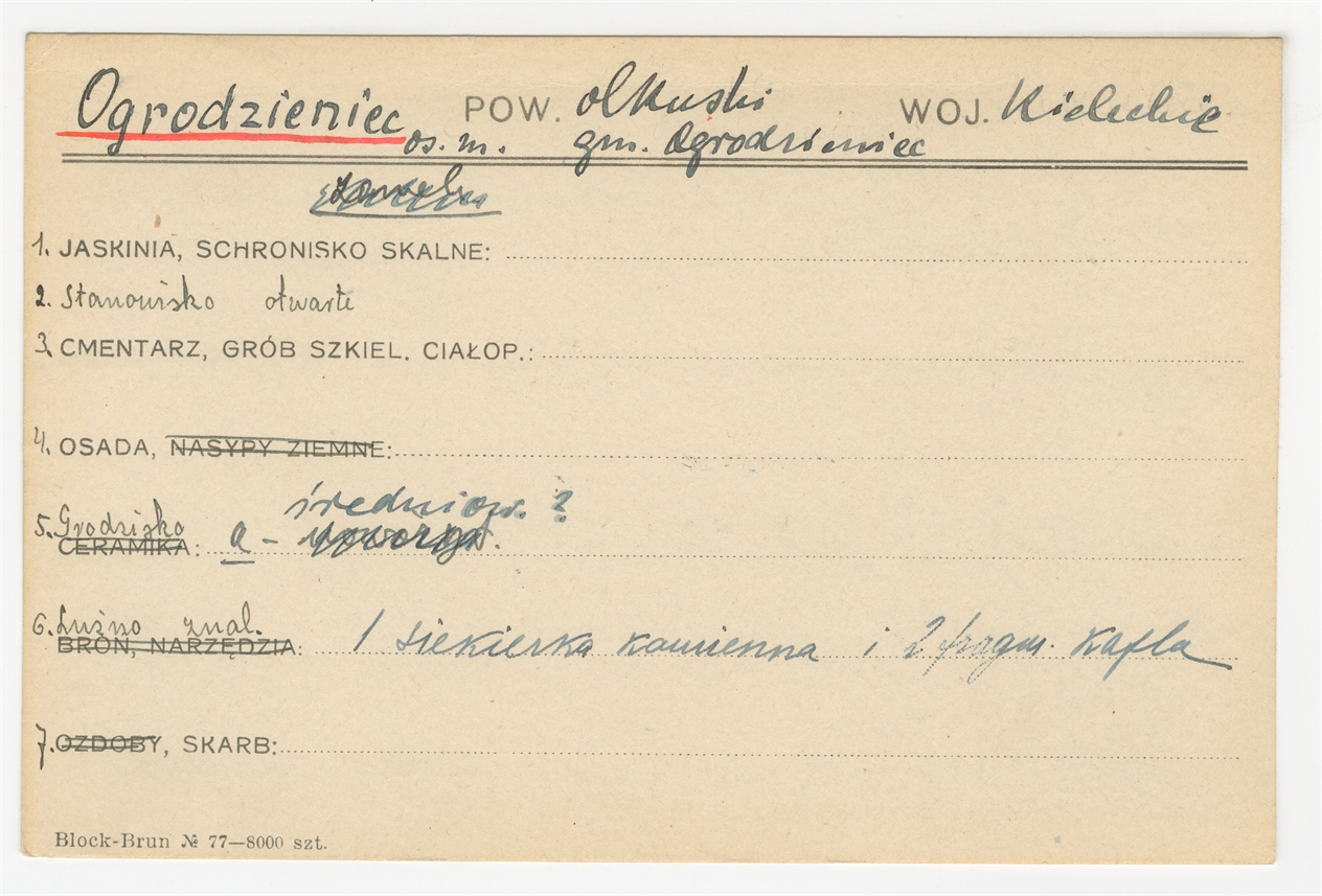 Karta stanowiska "Ogrodzieniec os. m. gm. Ogrodzieniec pow. Olkuski woj. Kieleckie" (druk rękopis) - strona 1