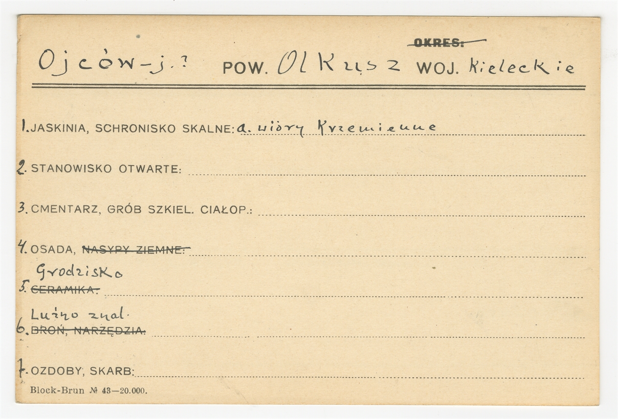 Karta stanowiska "Ojców-j? pow. Olkusz woj. kieleckie" (druk rękopis) - strona 1