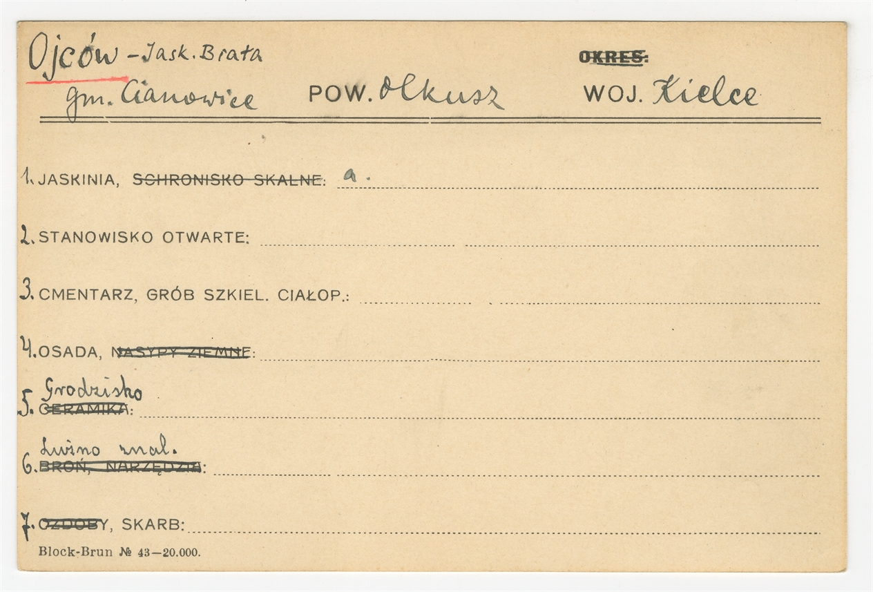 Karta stanowiska "Ojców - Jask. Brata gm. Cianowice pow. Olkusz woj. Kielce (druk rękopis) - strona 1