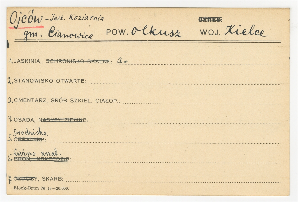 Karta stanowiska "Ojców - Jask. Koziarnia gm. Cianowice pow. Olkusz woj. Kielce (druk rękopis) - strona 1