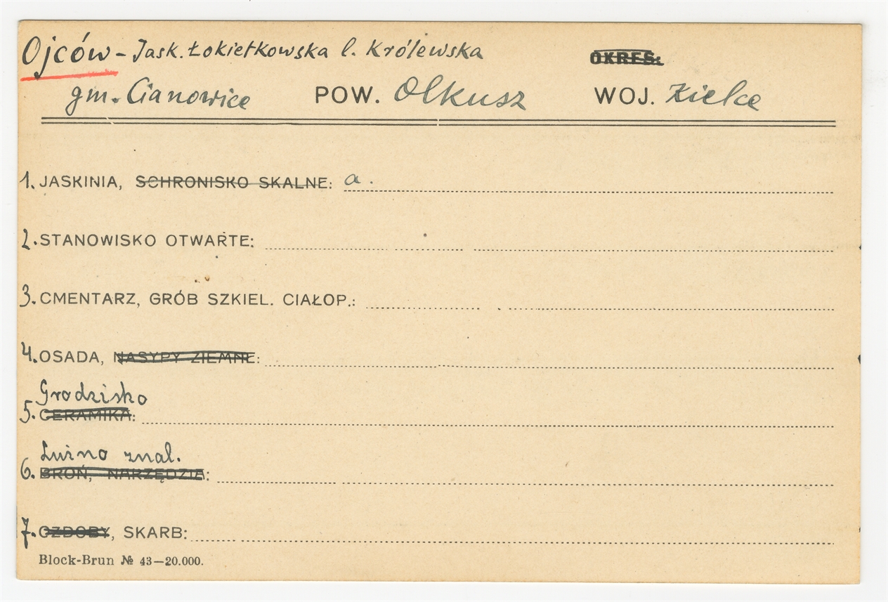 Karta stanowiska "Ojców - Jask. Łokietkowa l. królewska gm. Cianowice pow. Olkusz woj. Kielce (druk rękopis) - strona 1