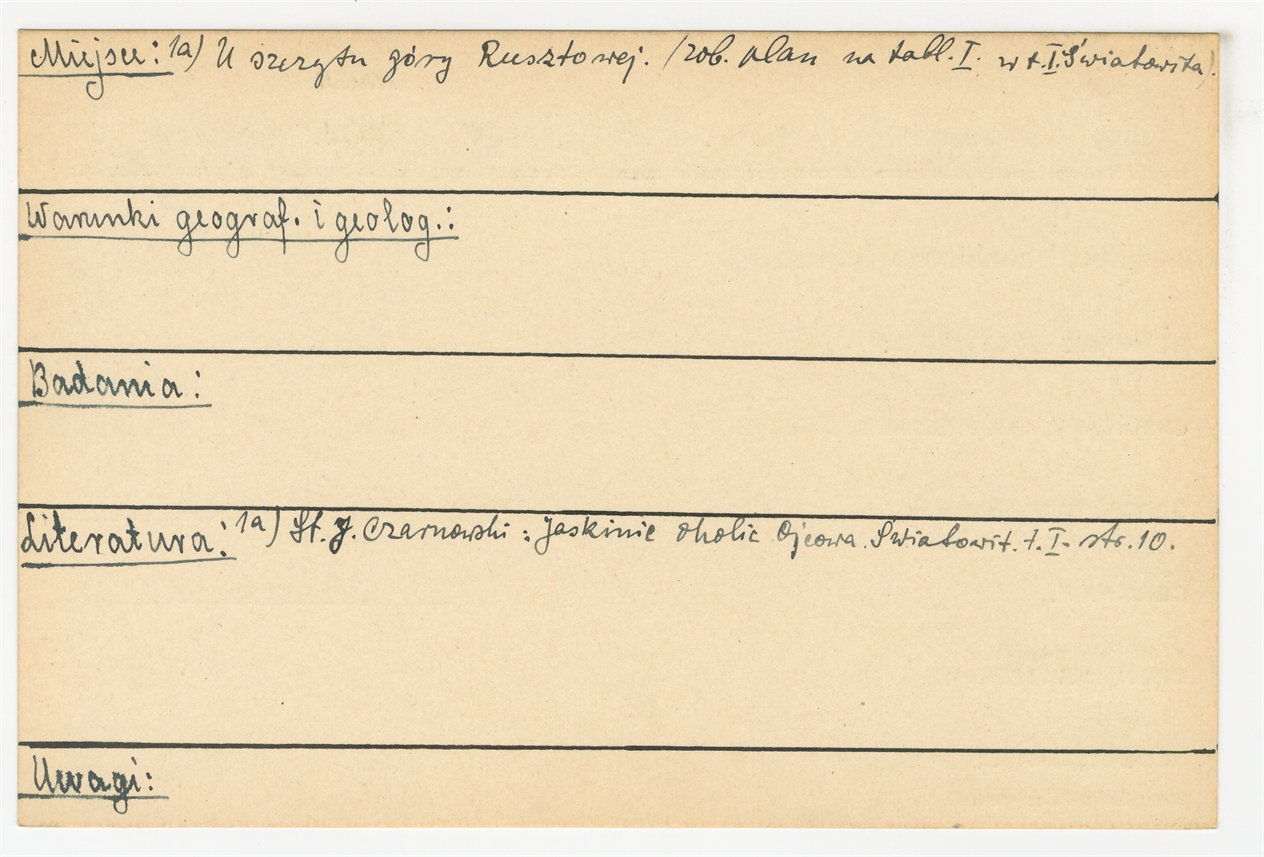Karta stanowiska "Ojców - Jask. Rusztowa gm. Cianowice pow. Olkusz woj. Kielce" (druk rękopis) - strona 1