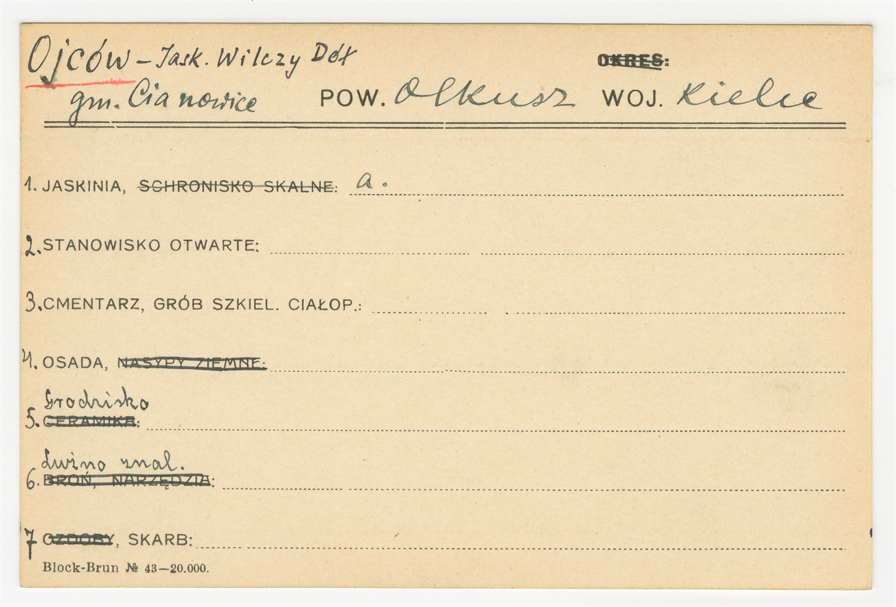 Karta stanowiska "Ojców - Jask. Wilczy Dół gm. Cianowice pow. Olkusz woj. Kielce (druk rękopis) - strona 1