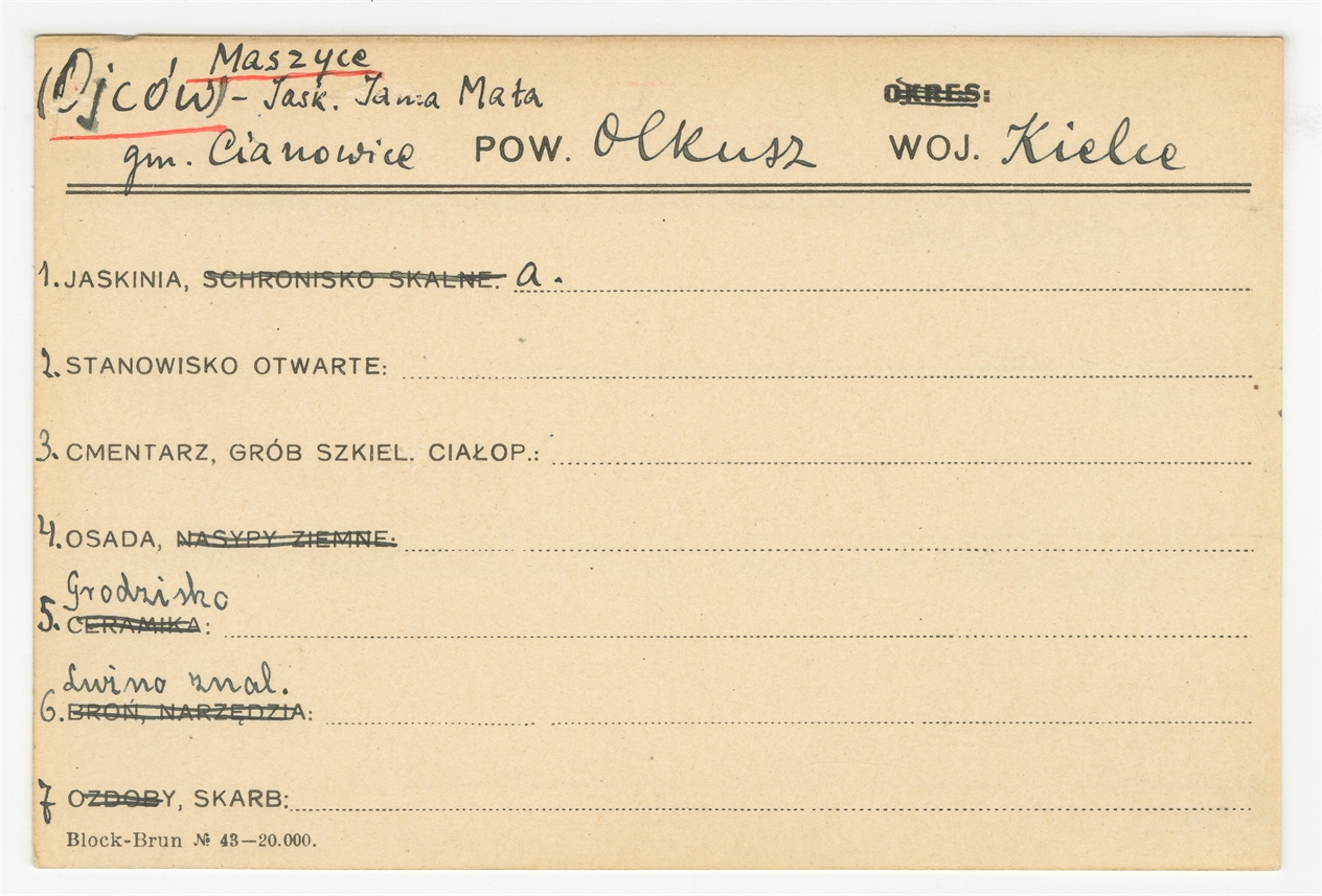 Karta stanowiska "(Ojców) - Maszyce - Jask. Mała gm. Cianowice pow. Olkusz woj. Kielce (druk rękopis) - strona 1