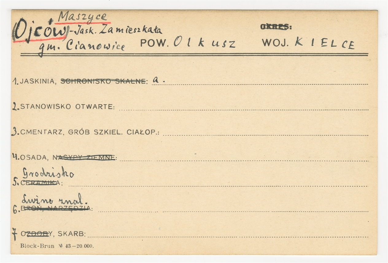 Karta stanowiska "(Ojców) Maszyce - Jask. Zamieszkała gm. Cianowice pow. Olkusz woj. Kielce" (druk rękopis) - strona 1