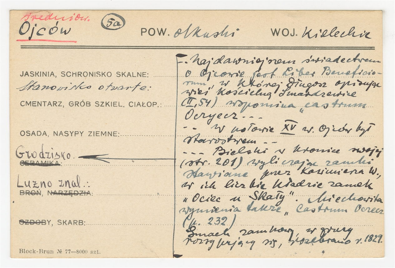 Karta stanowiska "Ojców pow. olkuski woj. kieleckie" (druk rękopis) - strona 1