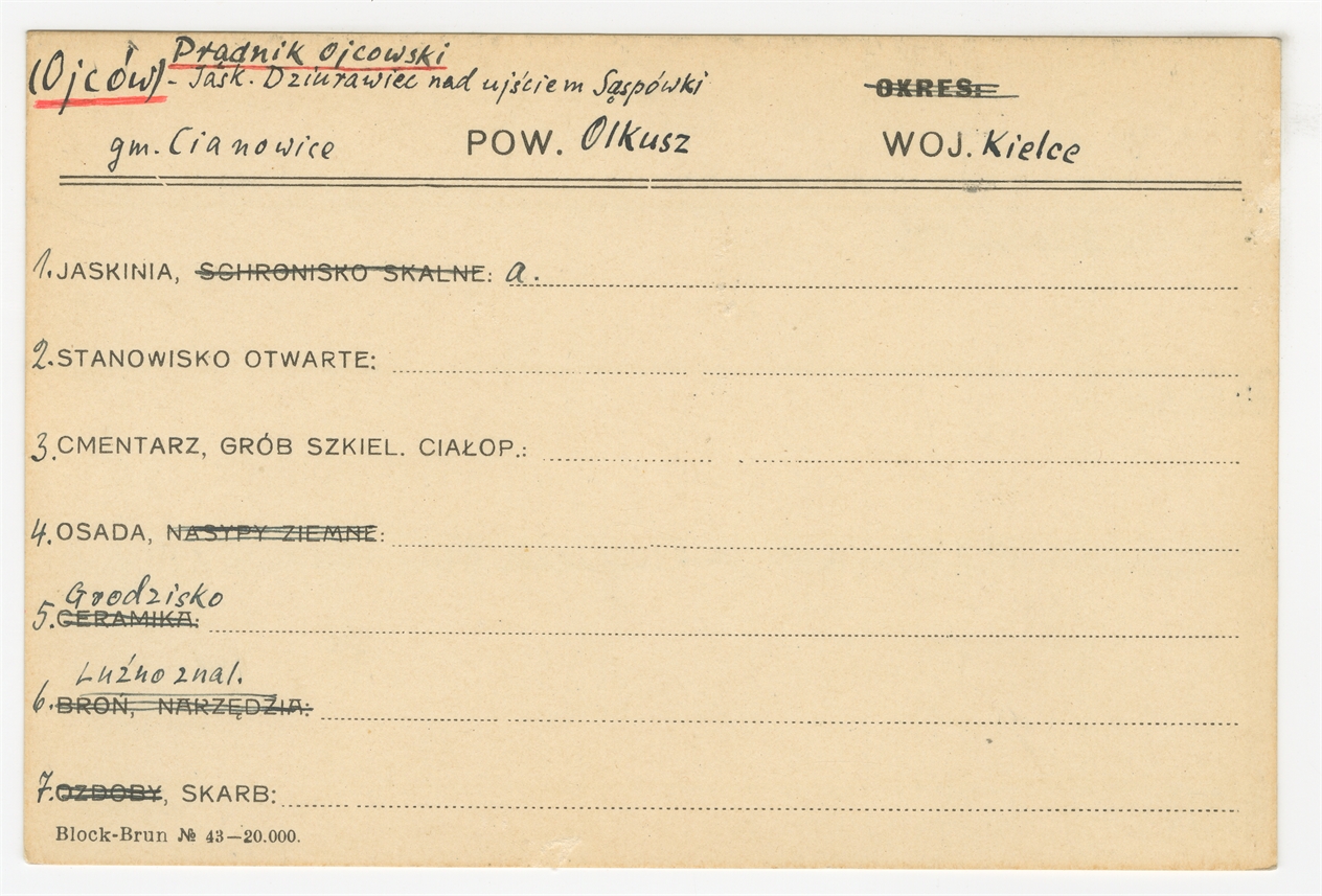 Karta stanowiska "(Ojców) Prądnik Czajowski - Jask. Dziurwaiec nad ujściem Sąspówki gm. Cianowice pow. Olkusz woj. Kielce (druk rękopis) - strona 1
