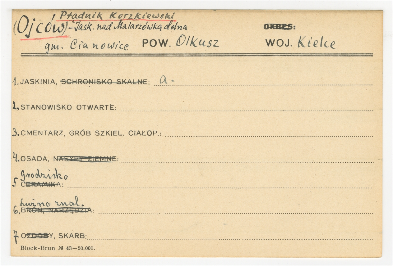 Karta stanowiska "(Ojców) Prądnik Korzkiewski - Jask. nad Malarzówką dolna gm. Cianowice pow. Olkusz woj. Kielce (druk rękopis) - strona 1