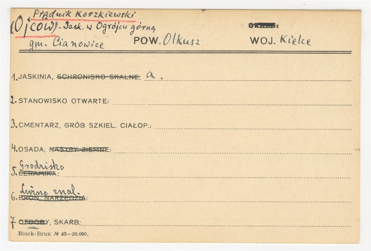 Karta stanowiska "(Ojców) Prądnik Korzkiewski - Jask. w Ogrójcu górną gm. Cianowice pow. Olkusz woj. Kielce (druk rękopis) - strona 1