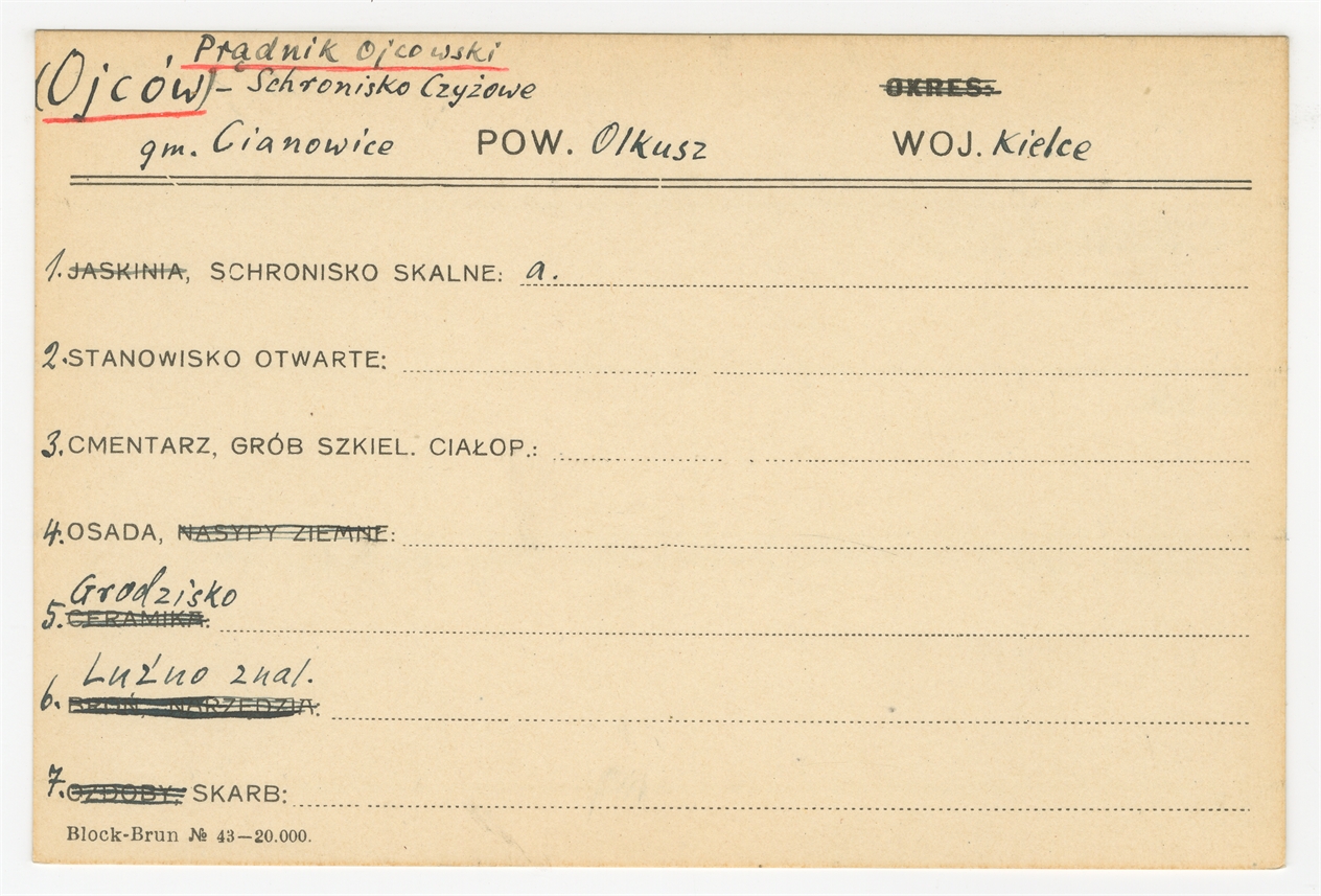 Karta stanowiska "(Ojców) Prądnik Ojcowski - Schronisko Czyżowe gm. Cianowice pow. Olkusz woj. Kielce" (druk rękopis) - strona 1