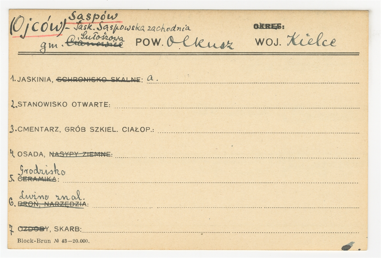 Karta stanowiska "(Ojców) Sąśpów - Jask. Sąspowska zachodnia gm. Sułoszowa pow. Olkusz woj. Kielce" (druk rękopis) - strona 1