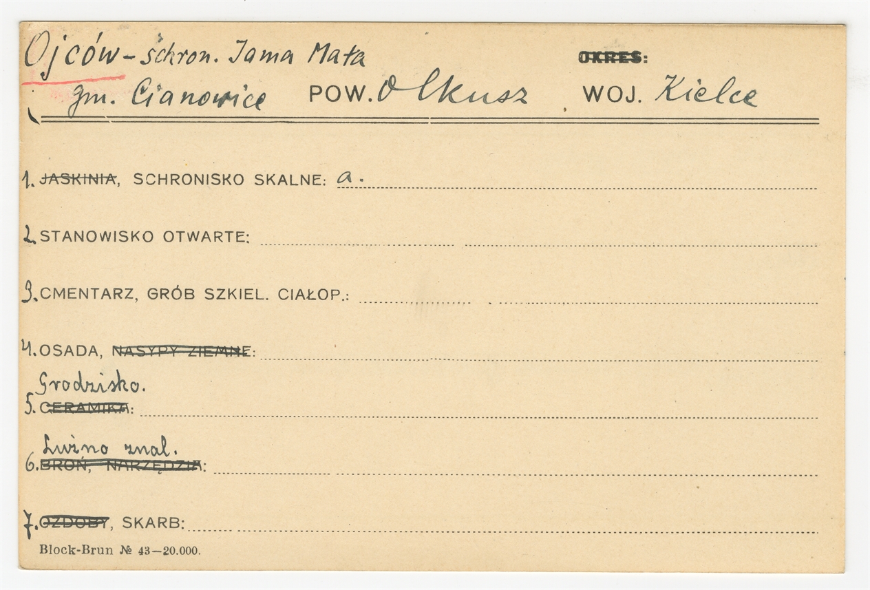 Karta stanowiska "Ojców - schron. Jama Mała gm. Cianowice pow. Olkusz woj. Ki elce (druk rękopis) - strona 1