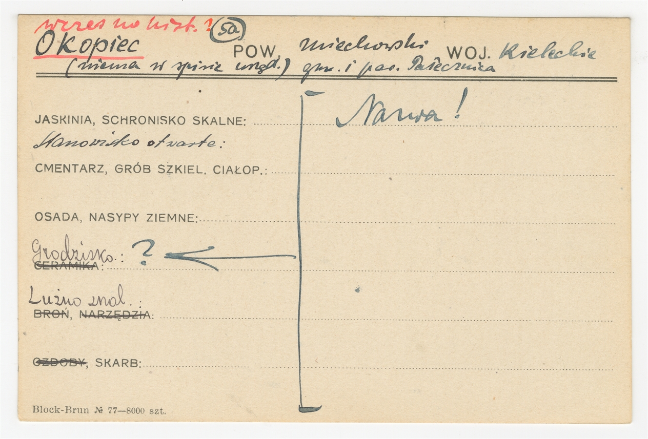 Karta stanowiska "Okopiec (niema w spisie urzęd.) gm. i pow. Pałecznica woj. kieleckie" (druk rękopis) - strona 1