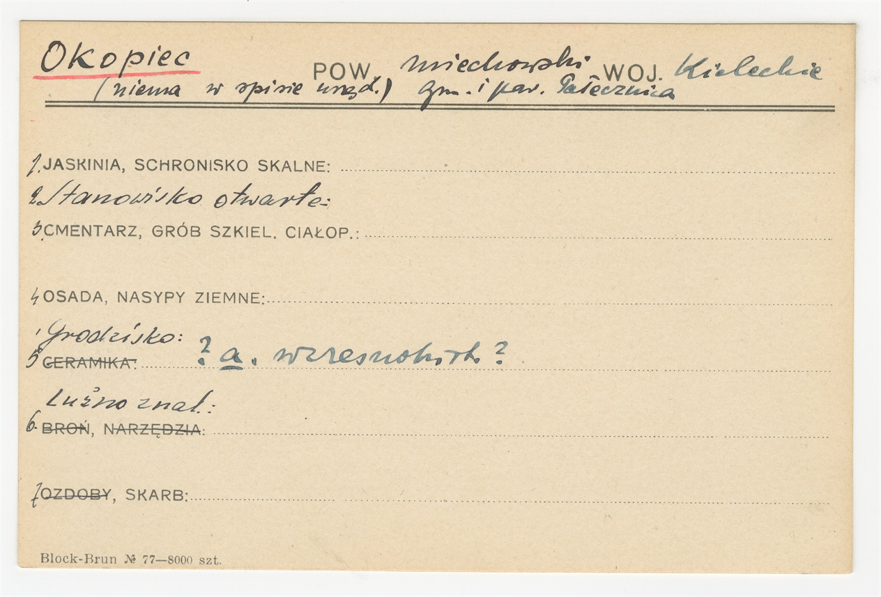 Karta stanowiska "Okopiec (niema w spisie urzęd.) gm. i pow. Pałecznica woj. kieleckie" (druk rękopis) - strona 1