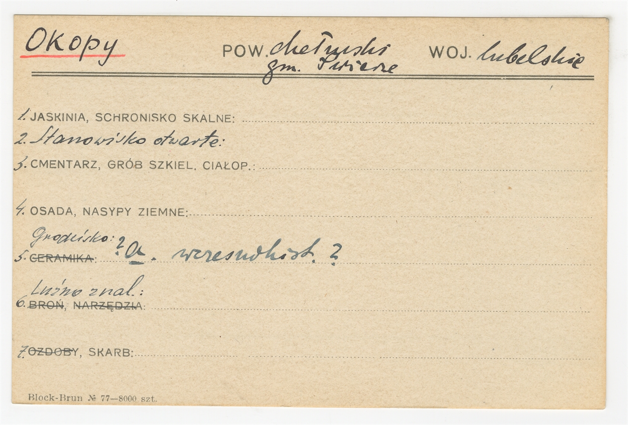 Karta stanowiska "Okopy gm. Świerze pow. chełmski woj. lubelskie" (druk rękopis) - strona 1