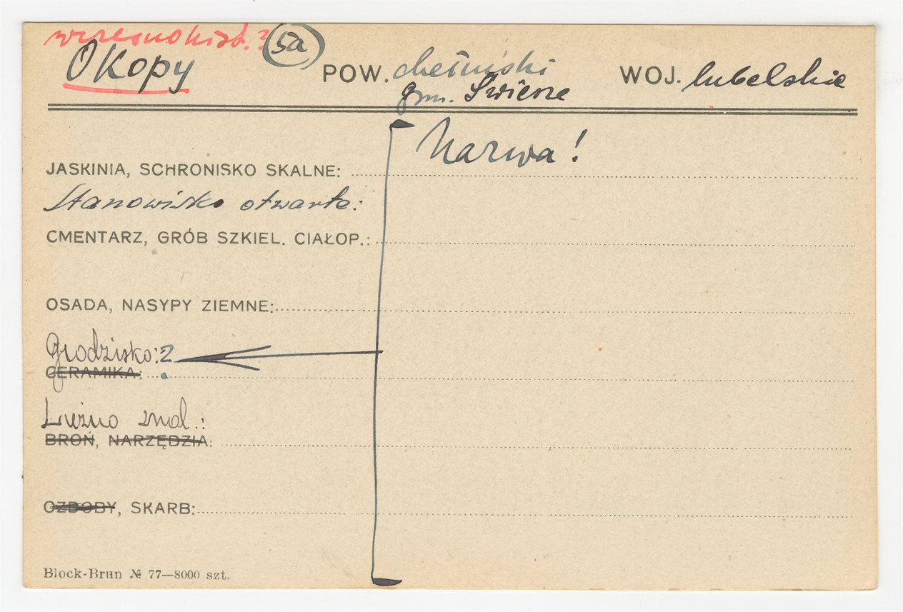 Karta stanowiska "Okopy gm. Świerze pow. chełmski woj. lubelskie" (druk rękopis) - strona 1