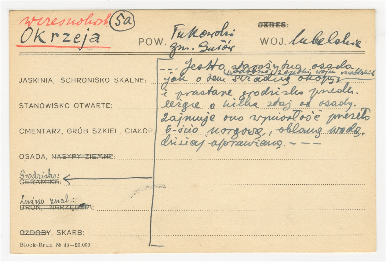 Karta stanowiska "Okrzeja gm. Sułów pow. łukowski woj. lubelskie" (druk rękopis) - strona 1