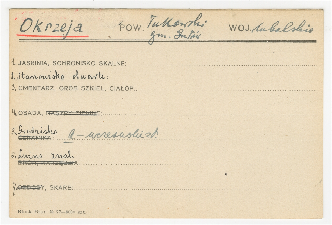 Karta stanowiska "Okrzeja gm. Sułów pow. łukowski woj. lubelskie" (druk rękopis) - strona 1