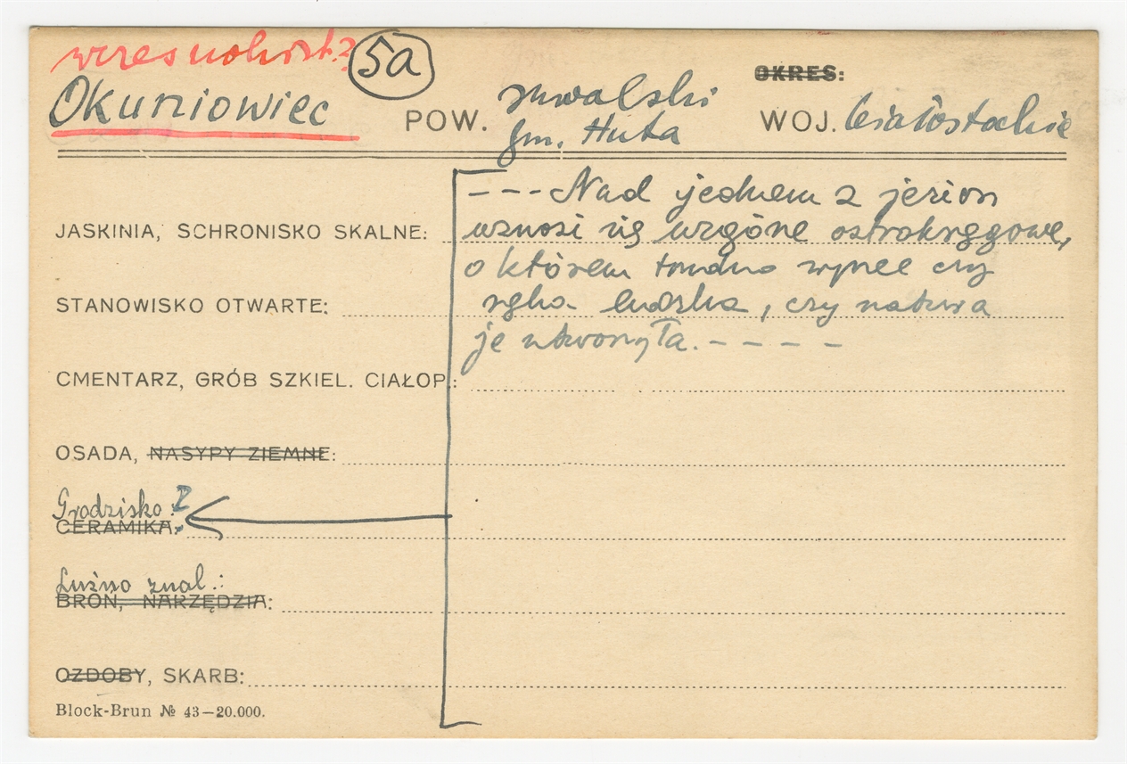 Karta stanowiska "Okuniowiec gm. Huta pow. suwalski woj. białostockie" (druk rękopis) - strona 1