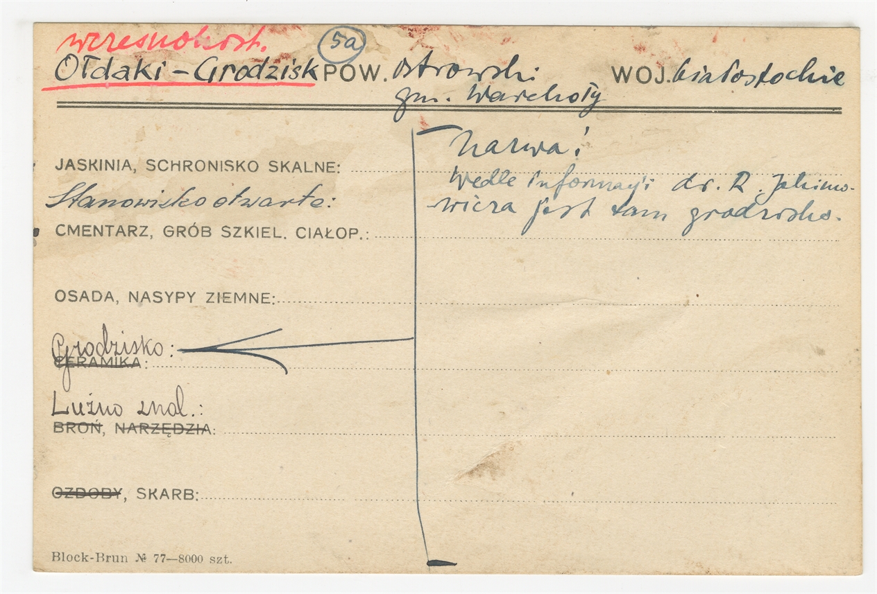 Karta stanowiska "Ołdaki - Grodzisk gm. Warchoły pow. ostrowski woj. białostockie" (druk rękopis) - strona 1