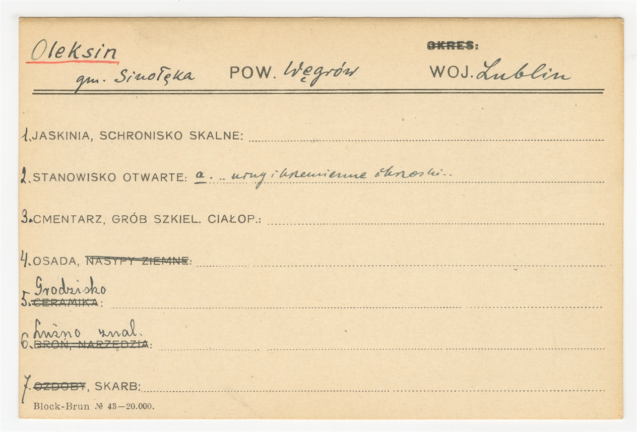 Element 1 - Karta stanowiska "Oleksin gm. Sinołęka pow. Węgrów woj. Lublin" (druk rękopis) - strona 1