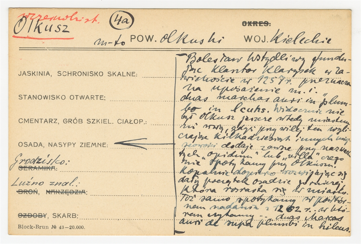 Karta stanowiska "Olkusz m-to pow. olkuski woj. Kieleckie" (druk rękopis) - strona 1