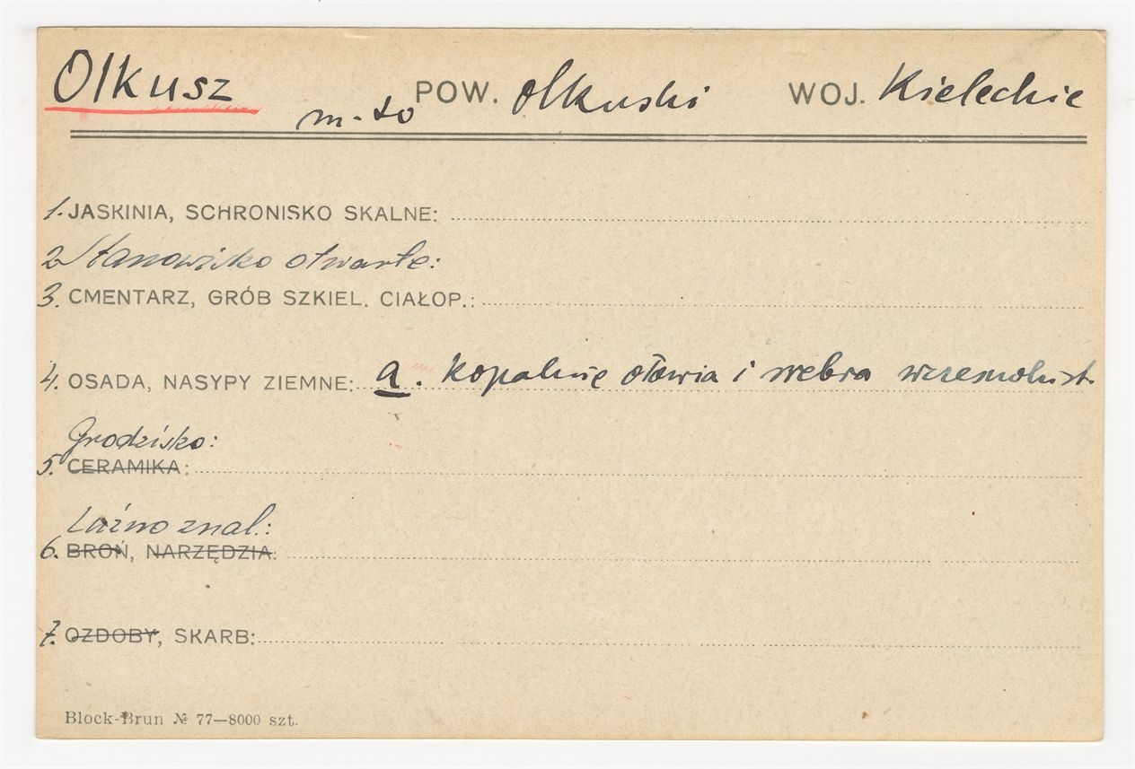 Karta stanowiska "Olkusz m-to pow. olkuski woj. Kieleckie" (druk rękopis) - strona 1