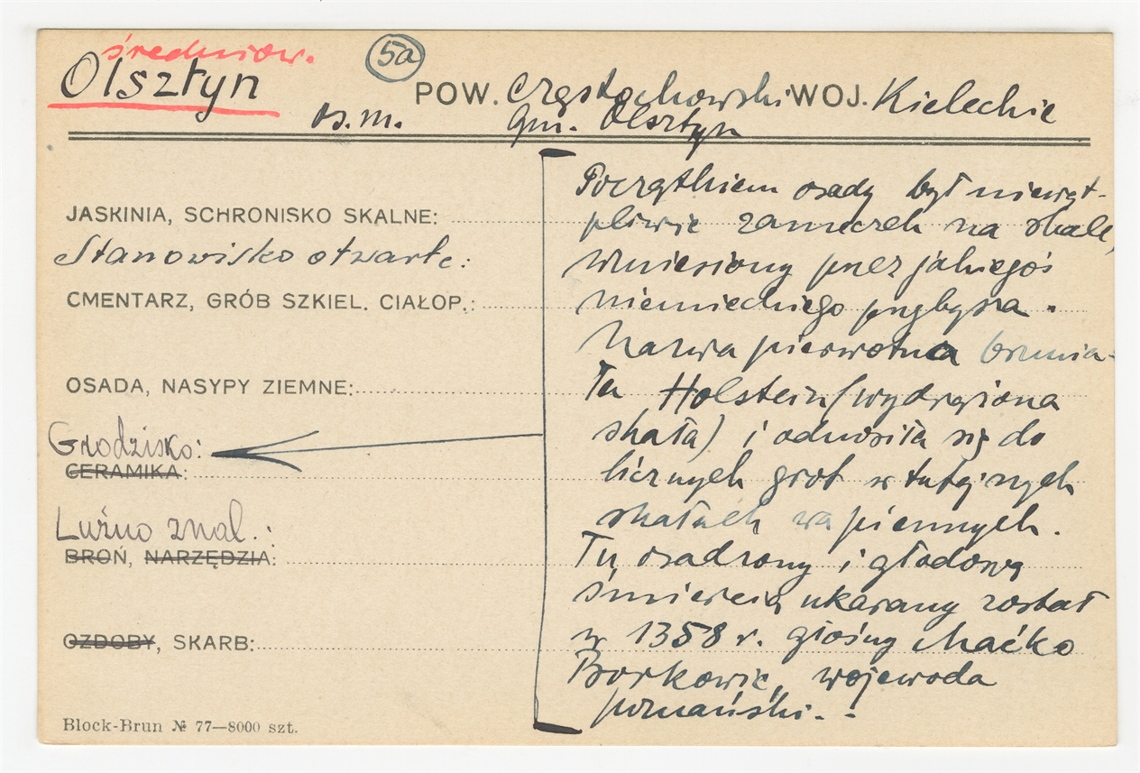 Karta stanowiska "Olsztyn os. m. gm. Olsztyn pow. Częstochowski woj. Kieleckie" (druk rękopis) - strona 1