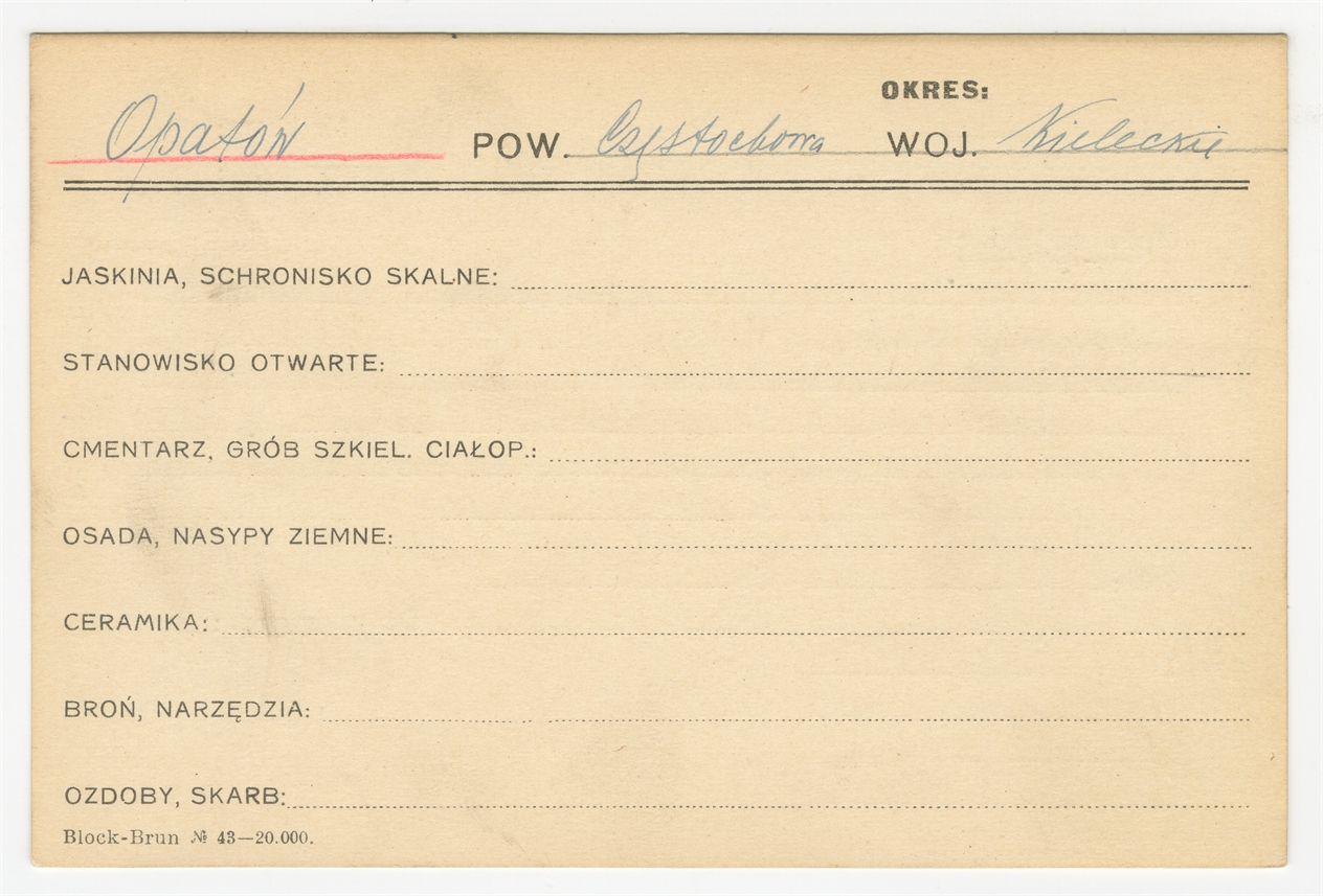 Element 1 - Karta stanowiska "Opatoń pow. Częstochowa woj. Kieleckie" (druk rękopis) - strona 1