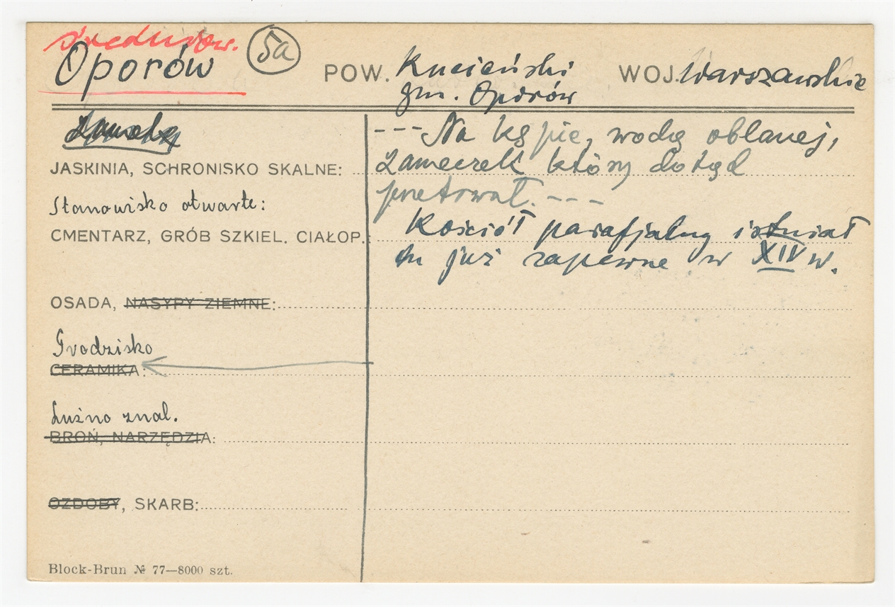 Karta stanowiska "Oporów gm. Oporów pow. Kucieński woj. Warszawskie" (druk rękopis) - strona 1