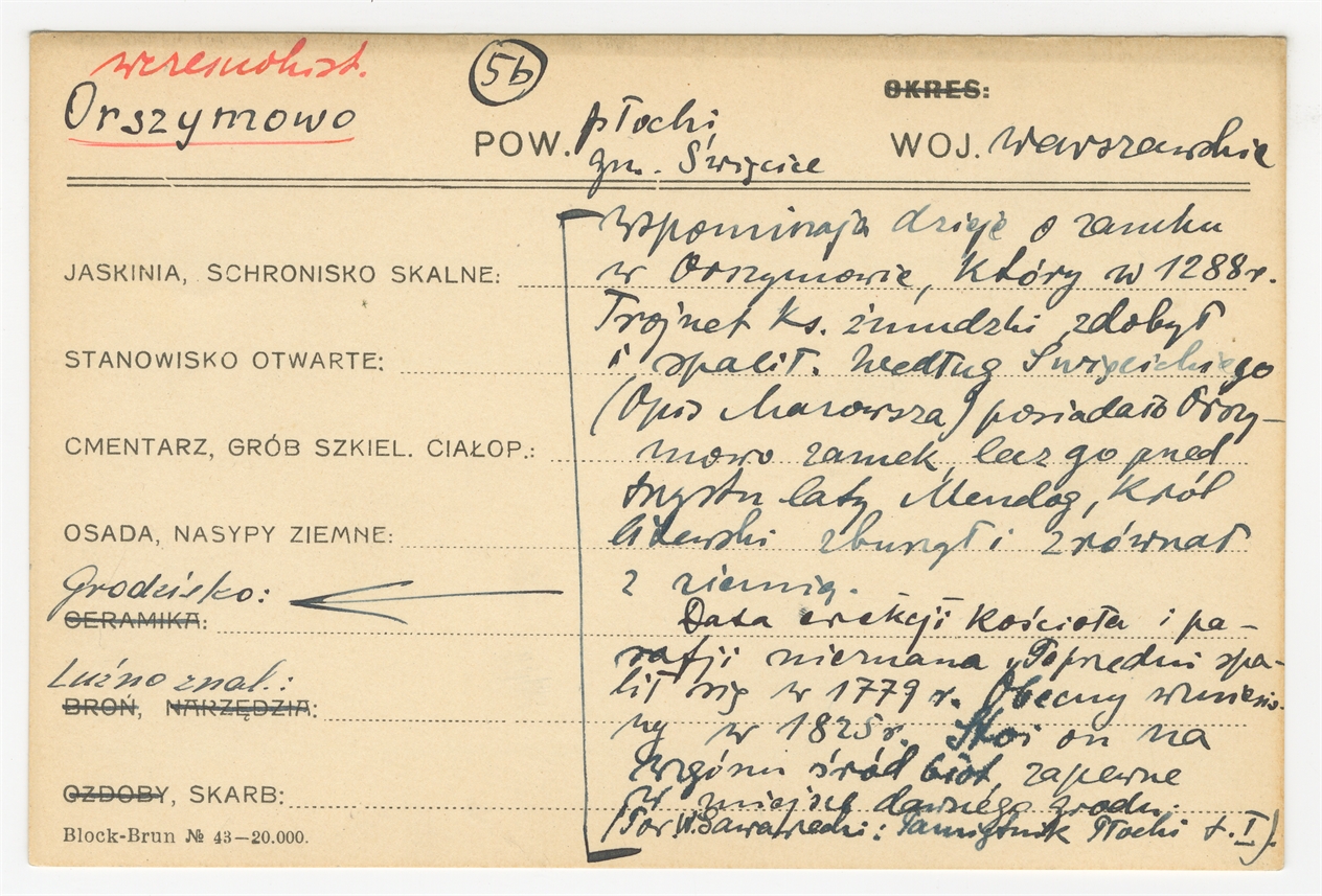 Karta stanowiska "Orszymowo gm. Święcice pow. płocki woj. Warszawskie" (druk rękopis) - strona 1