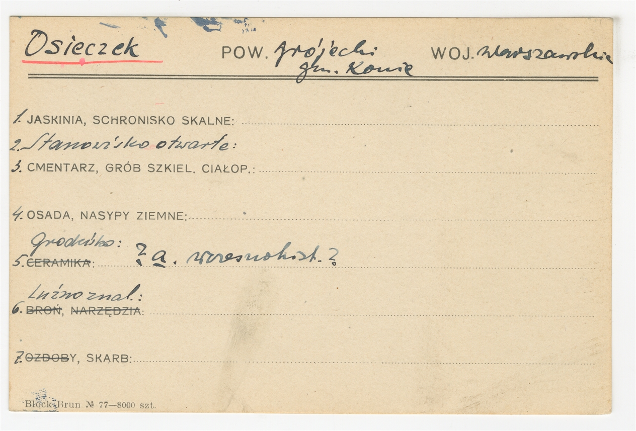 Element 1 - Karta stanowiska "Osieczek gm. Konie pow. grójecki woj. warszawskie" (druk rekopis) - strona 1